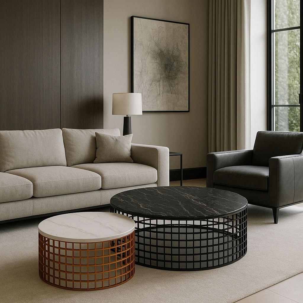Our centre table set MOON translates our minimalist design philosophy. The metal allied to our finishes and different meshes gives a special highlight to these tables. The tops can be supplied in tempered glass, marble, wood, cork or mirror.
