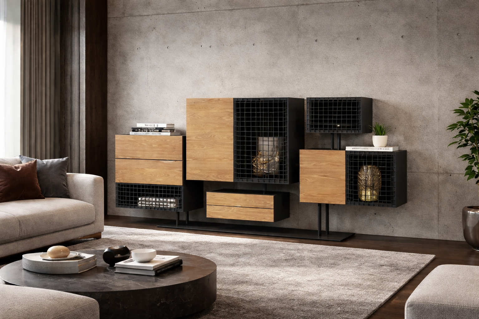 Le buffet KUBIK se caractérise par son irrévérence. La combinaison unique de matériaux, entre l’acier, le bois et le garde-corps Cobermaster, ainsi que la créativité et les méthodes de fabrication développées par Cobermaster Concept, permettent de créer cette pièce avec 5 modules suspendus et différentes finitions disponibles.