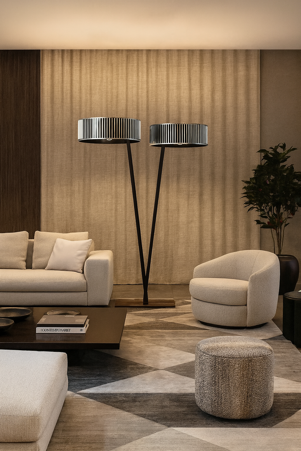 La beauté minimaliste pure est la définition idéale pour la lampe TWINS, une lampe double symétriquement parfaite. Les couronnes métalliques qui entourent les abat-jour ajoutent une touche particulière de raffinement. Cette lampe peut être fabriquée avec une base en acier, en verre trempé ou en bois.