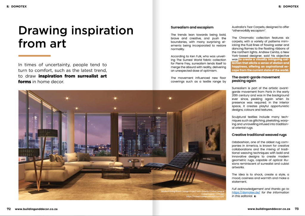 Candeeiro de Pé Divergent, Chaise Longue Gravity e Mesa de Centro Moon detacados na Revista Floors in Africa, 2023
